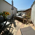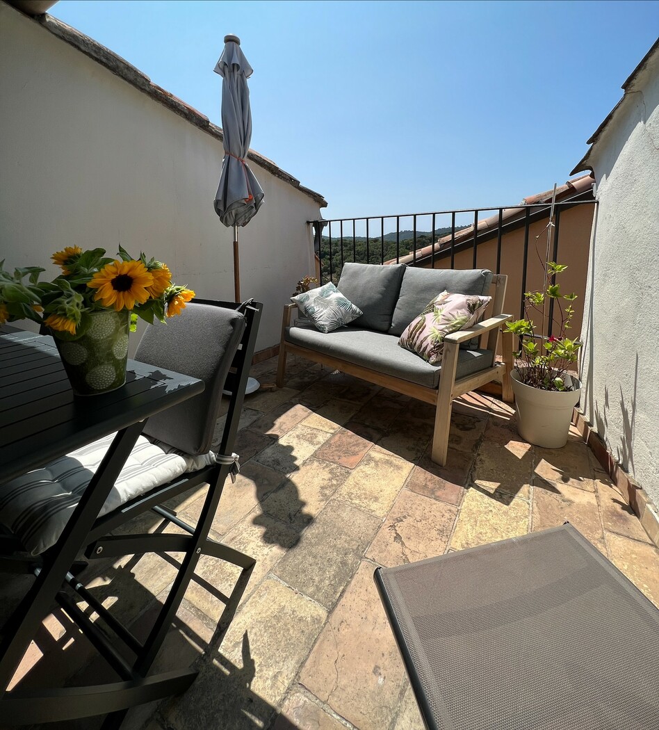 Affitto di un'intera casa di paese, nel centro di Ramatuelle, su due livelli, con 2 camere da letto, soggiorno/cucina, 2 bagni con doccia, 1 WC separato e una terrazza con vista mare.